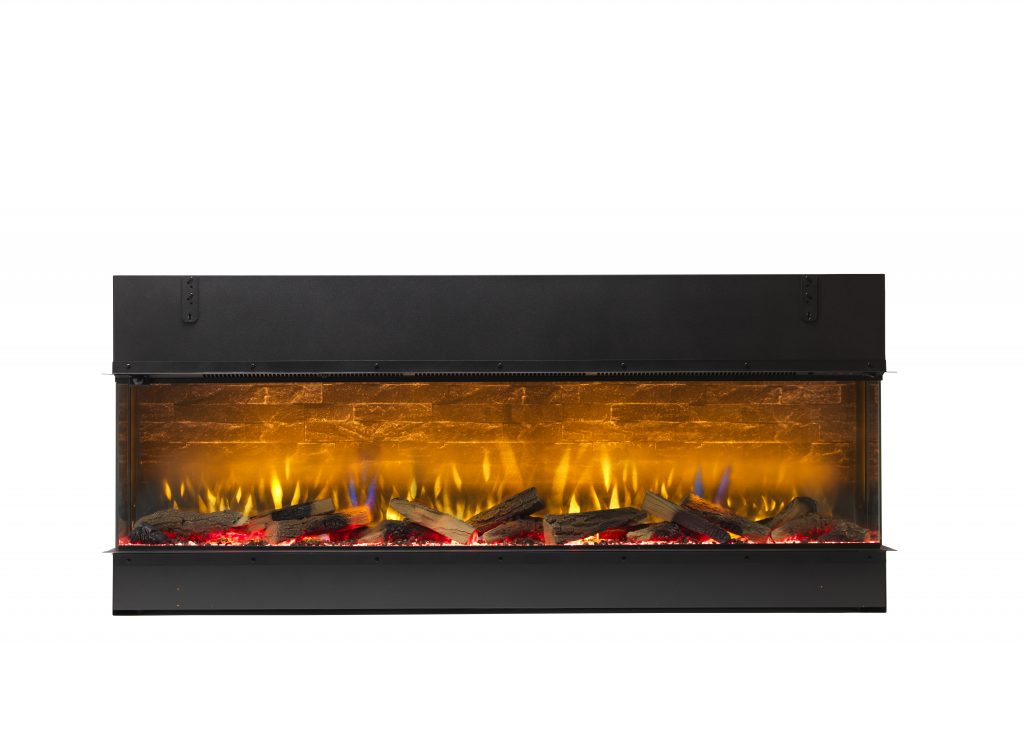 Тухленият интериор дава уникален широк изглед към живите пламъци. Тези пламъци се издигат без отражения и отблясъци от реалистичните, блещукащи и тлеещи дърва в центъра на камината.